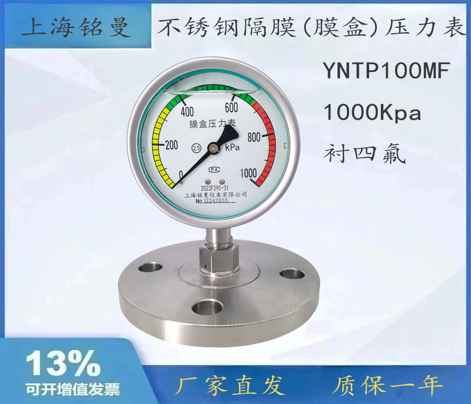铭曼 耐震隔膜压力表YNTP150BF,DN25法兰➕四氟,-0.1~0.9mpa ...